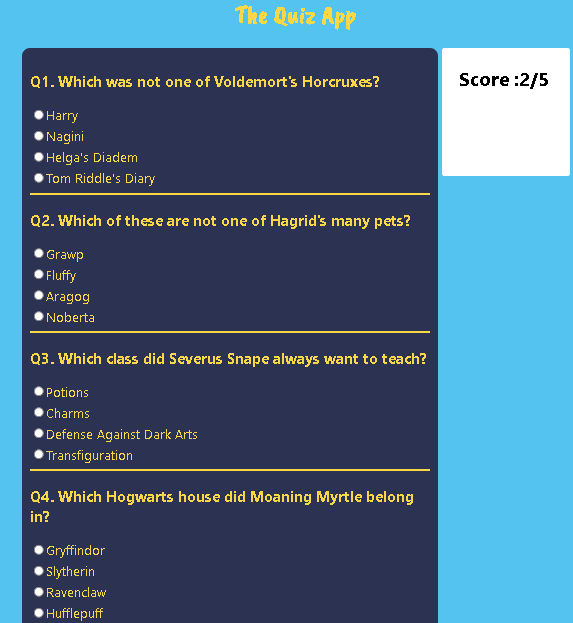 The Quiz App is an interactive application that allows users to test their knowledge on various subjects through multiple-choice questions. It features a user-friendly interface where users can select answers, receive immediate feedback, and track their scores. Built with React, the app fetches questions from a public API and dynamically updates the UI based on user interactions.